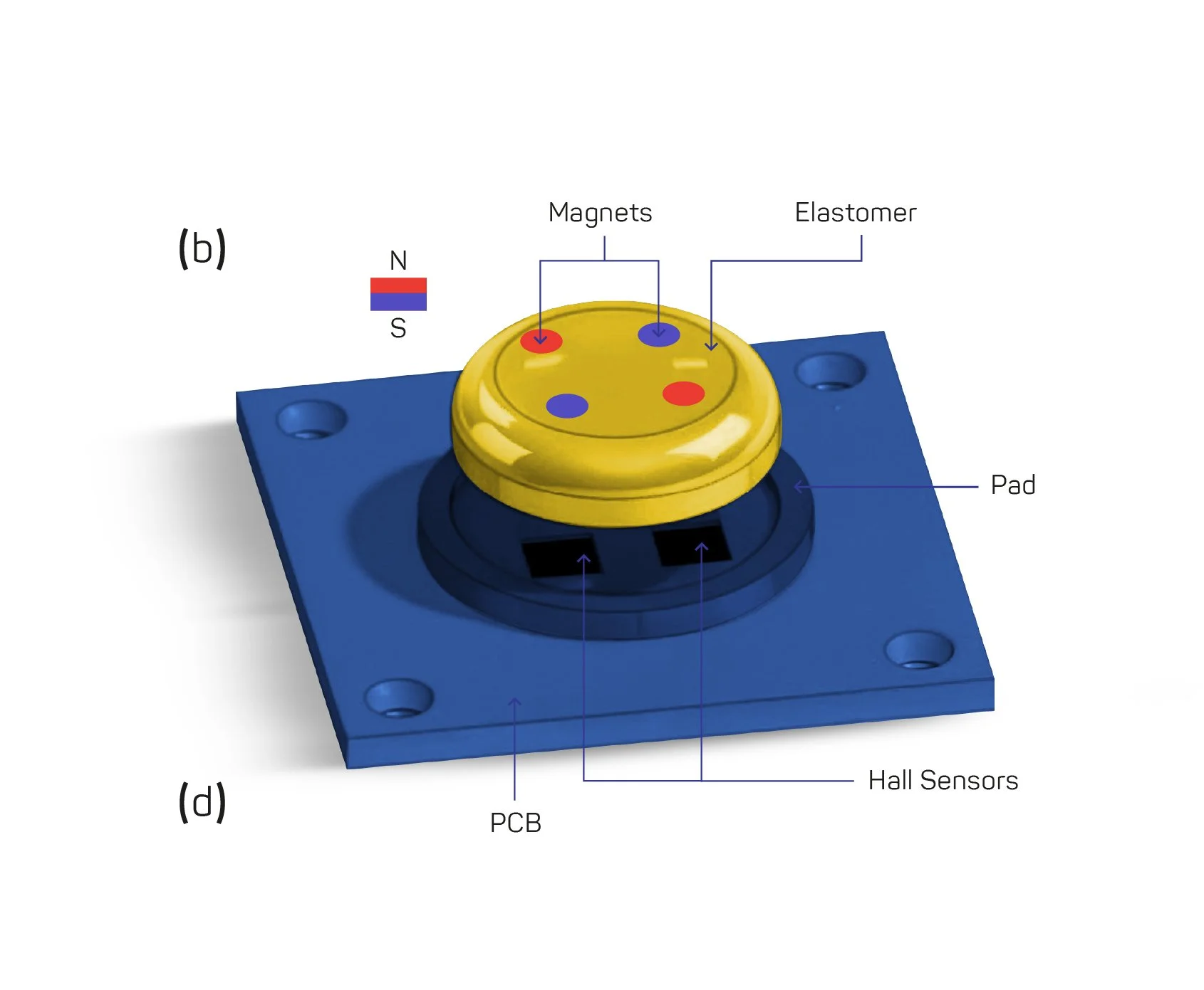 Advantages: Compared to piezoresistive or piezocapacitive approaches, a Hall-effect tactile sensor is better at detecting shear forces.